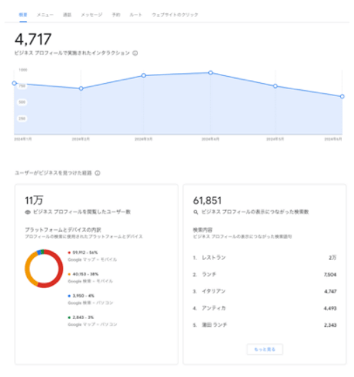 小売店の事例では、Googleビジネスプロフィールのオーナー登録と基本情報 登録のみで、店の表示回数が594%アップ、公式Webサイトへのアクセス数が 622%アップ、ルート検索数(お店への行き方検索)が336%アップ、電話での 問い合わせ数が